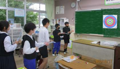 空気でっぽう(4年1組) 公開日 2022/10/17 更新日 2022/10/17 学校全体 10月17日(月)、「閉じ込めた空気はおされるとどうなるのか」について、空気でっぽうで実際に体験しながら考えていました。的にあてるというお楽しみも取り入れながら、手の感触や音などを確認していました。