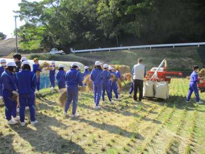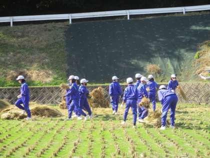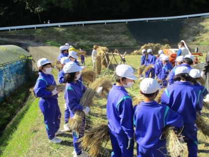 10月28日(金)、お世話してくださっている地域の方、お二人に教えていただきながら、5年生が脱穀をしました。大人も子どもも、みんなで協力し合って、やり遂げられたなという思いがしました。特に、5年生は、何回も黙々と脱穀の作業をしたり、進んで束ねた稲を運んだりと、一人ひとりの頑張りがすごかったです。収穫したもち米は、なんと210.5kgでした。