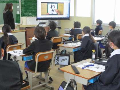 1月18日(水)、書写の時間です。今日から「わざ」の練習です。書き方のポイントを動画などで確かめた後、筆を使って練習していました。