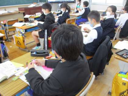 色紙で(3年2組) 公開日 2023/01/19 更新日 2023/01/19 学校全体 算数の時間です。今日は、正方形から三角形を作るということで、色紙を使っています。いろいろな二等辺三角形や正三角形を作りました。