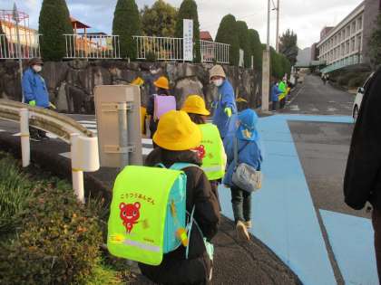 3月2日(木)、4月から新1年生となる年長さんが集団登校班に入って登校してきました。門のところで安全を見守ってくださるふるさとの会の方々にあいさつしている姿も見かけました。入学を待っていますよ。