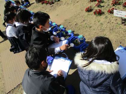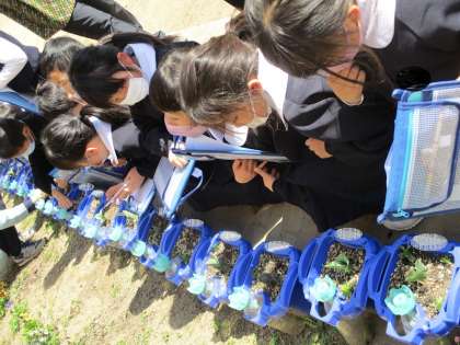 1年生のチューリップの芽がぐんぐん伸びています。4時間目に1組さんも2組さんも、チューリップの芽を見に来ました。自分の指と長さを比べたり、○○みたいだなとたとえたりしながら観察しました。