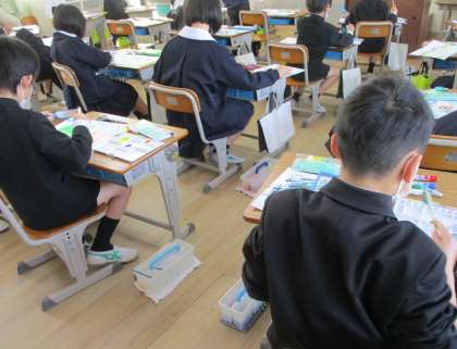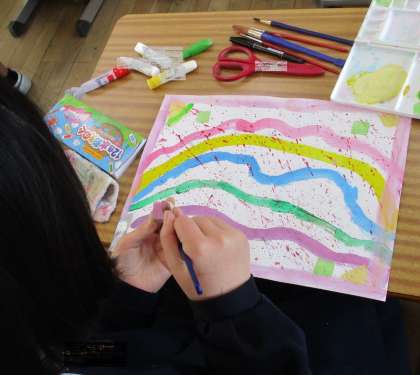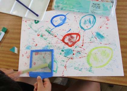 歯ブラシやビー玉、積み木などを使って、絵の具の色のつけ方を工夫した作品作りをしていました。