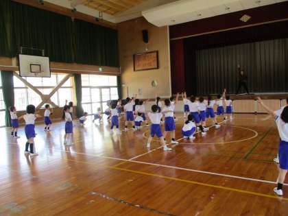 体操服に着替えて体育館で体育の時間です。並び方や準備運動などの後、体を使ったじゃんけんゲームをしました。楽しかったようで「もっとやりたい。」の声も多くあがっていました。