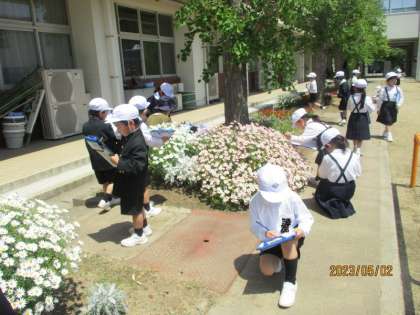 季節のもの見つけ(1年生) 公開日 2023/05/02 更新日 2023/05/02 学校全体 生活科の時間です。中庭で季節のものを探して、絵でワークシートに描きました。花や葉や虫など、いろいろ見つけていました。