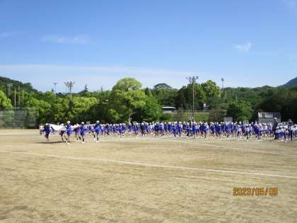 5月9日(火)、大運動場で初めての全校練習をしました。今日は、入場と開会式です。入場してきて列を整えながら並ぶのは難しいですが、1年生もがんばっていました。