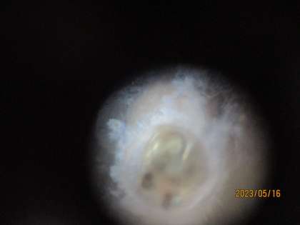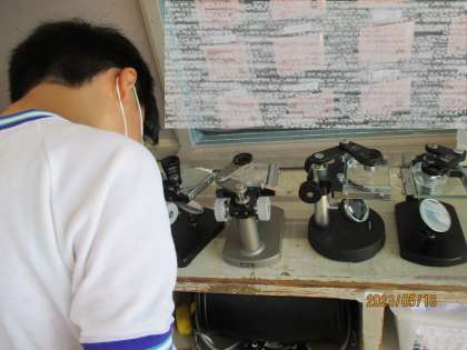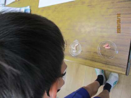 インゲン豆とメダカの卵の観察をしています。インゲン豆は後に芽を出し茎や葉などになる部分を確認しています。メダカの卵は、目などがくっきりとしてき、もうすぐ誕生しそうです。教室の後ろで毎日観察して楽しみにしています。