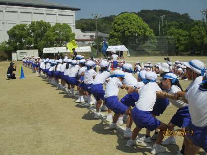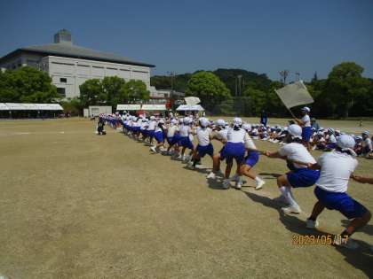 体育祭予行(綱引き) 公開日 2023/05/17 更新日 2023/05/17 学校全体 予行での綱引きが予選をかねていたので大変盛り上がりました。本番では、優勝戦と3位決定戦を行うことになっています。