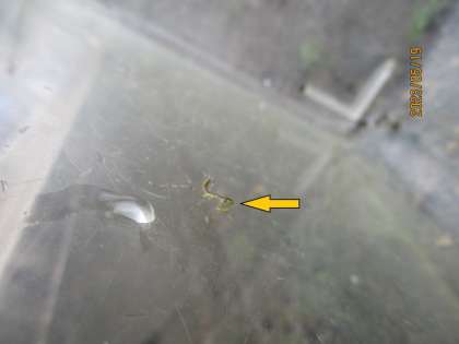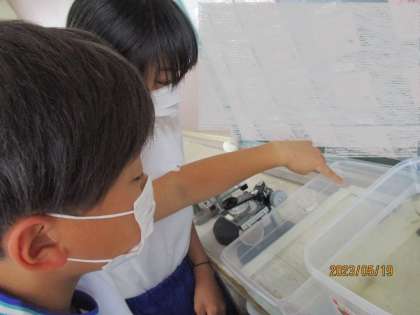 5年1組さんのメダカの赤ちゃんが二匹生まれました。どこだろうと探していると、「ここだよ。」と教えてくれました。本当に小さな小さな赤ちゃんです。また、4年2組さんでは、カマキリの赤ちゃんが生まれました。これまた小さな小さな赤ちゃんです。