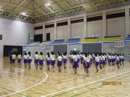 今日は雨で運動場での練習ができませんでした。5、6年生の集団行動の練習は広いところでしたいということで、総合体育館に移動して、列の並びに気をつけて移動する練習をしました。ちょうど、体育祭が雨だったらということで、総合体育館を予約していたので、使うことができました。昨年リニューアルしたばかりの、広くてきれいな総合体育館が使えてよかったです。