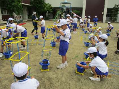 支柱をつけました(2年生) 公開日 2023/05/20 更新日 2023/05/20 学校全体 先日植えたミニトマトの苗に支柱をつけました。けっこう苗が大きくなっているので、支柱をつけると一安心ですね。