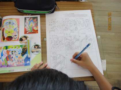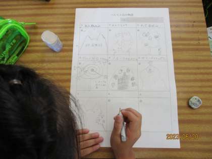へんてこな、ありえない山を自由に想像し、楽しいお話を考えながら、いろいろな場面を絵に描いていました。4年1組さんの発想力はとても豊かで、楽しい絵やお話をたくさん教えてくれました。