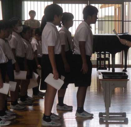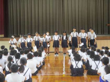 朝の時間に、2学期の学級委員さんの任命式を行いました。1年生から6年生まで、各学級2名ずつの学級委員さんが決まっており、その任命です。12月22日までの2学期、遠足や修学旅行、宿泊学習、マラソン大会などいろいろな行事もあります。どの学級も、スローガン「みんな笑顔 元気 協力」を忘れず、温かい学級にしていってほしいものです。