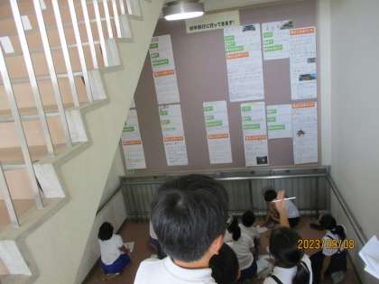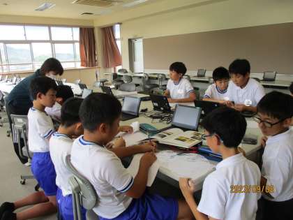 9月21日の全校ことばタイムには、6年生が発表する予定です。6年生は、修学旅行で見学する予定のお寺について発表するようです。1組、2組合同で、3つのグループに分かれて、発表原稿を作っていました。本をもとに話し合っていたり、掲示されている以前のまとめを調べたりしていました。