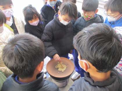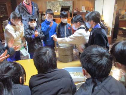 楽しみにしていた、詫間民俗資料館での体験活動をしてきました。火起こし、水運び、洗濯板での洗濯、縄ない、炭火アイロンなどたくさん体験しました。そして、今年は、きなこおむすびを食べることもできました。写真は、大豆をほうろくで煎って、石臼でひき、できたきなこを、かまどで炊いていただいたごはんに付けて、おむすびができたところです。