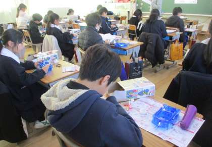 理科は、電磁石の学習をしています。今日は、キットを組み立てています。説明書通りに組み立てるのは大変そうです。