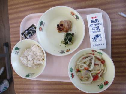 4日目の今日は、郷土料理のうちこみ汁でした。香川県産の金時にんじんやだいこんなども入っていてとてもおいしかったです。その他は、麦ご飯、鶏肉のもろみ焼き、たべてなのしそあえ、のりのつくだに、牛乳でした。