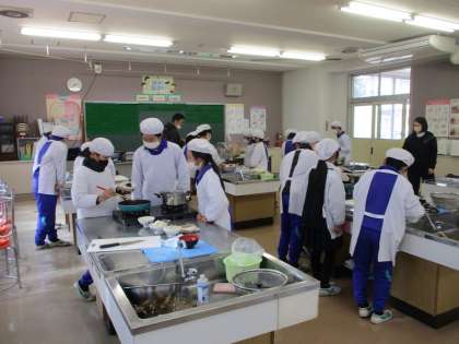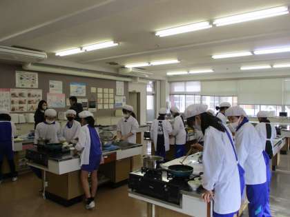 5年2組さんが、家庭科の調理実習で、ご飯を炊いておみそ汁を作りました。5時間目が終わった頃、とてもいいかおりがしたので、家庭科室におじゃますると、ご飯にのせる「ふりかけ」を作っているところでした。ごま油のいいかおりが職員室まで届いていたのです。2組さんと一緒に試食させていただきましたが、ごはんもおみそ汁も「ふりかけ」もとてもおいしくできていました。ごちそうさまでした。