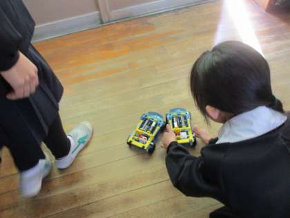 モーターの回転が車輪に伝わって走るモーターカーを作っていました。モーターが回転するようになっても、車輪が回り車が走るようになかなかならず、苦戦していました。モーターの力を強めるために巻き数を増やしたらどうかという意見が出てそうすることになったようです。