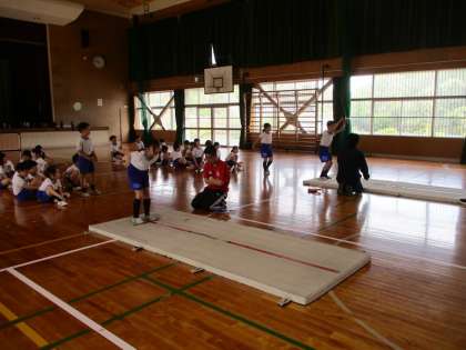 今年も新体力テストが始まっています。3時間目には3年生が立ち幅跳び、4時間目には5年生が反復横跳びをしていました。