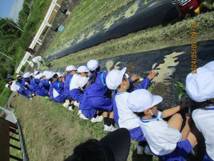 今年も1年生が幼稚園の年長さんと一緒にサツマイモのつるさしをしました。農業委員の方々や分館長さんに教えていただきながら、たくさんのサツマイモの苗を土の中にしっかりと入れていくことができました。秋の収穫が楽しみですね。お世話をしてくださった皆様、ありがとうございました。