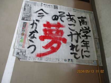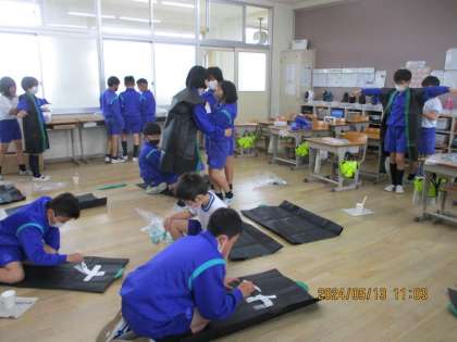 はっぴに字を書いているところを撮影することができました。書く位置を協力し合って確かめたり、自分のはっぴに思い思いの字を書いたりしています。廊下には、ダンスで使う旗もできあがっていました。