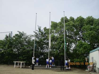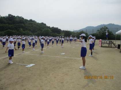5月15日(水)、19日の地区体育祭の予行をしました。入場から開会式、ラジオ体操までとてもスムーズに進めることができました。練習回数の少なさをふきとばした感じの上小っ子たちです。