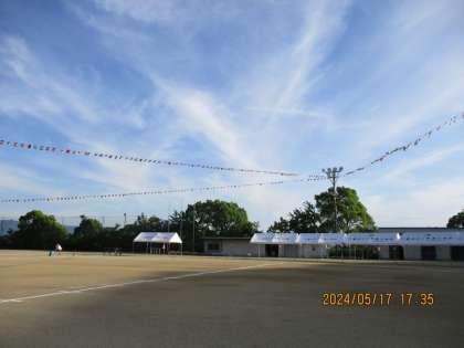 体育祭ならではの万国旗。いつもスポーツ協会の方があげてくださっています。今年度は小学校の準備が平日となりましたが、おいでてあげてくださいました。大運動場に万国旗がはためいています。スポーツ協会のみなさま、ありがとうございました。明日朝の準備もよろしくお願いいたします。