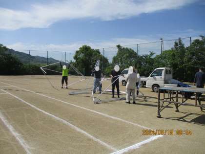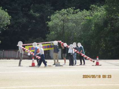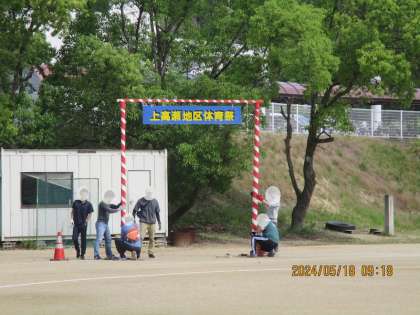 5月18日(土)、スポーツ協会の皆さんが明日の地区体育祭に向けての準備として、地区や入場待機場所のテントの設営や入場門、退場門の設置などをしてくださいました。ありがとうございました。入退場門が立ち、ますます体育祭の雰囲気が高まっている大運動場です。