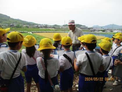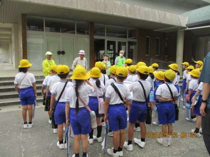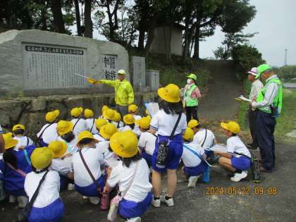 3年生の町探検がスタートしました。今日は1区です。4名の上小ふるさとの会の方が、交通を見守ってくださったり、たくさんのことを教えてくださったりしました。まず始めは、高速道路の関係で音田川の流れを変える工事が行われたことを教わりました。観山先生や竹堂先生の石碑では、お二人の業績について知りました。また、産巣日(むすび)神社にも行きました。24日(金)には、2区に行く予定です。