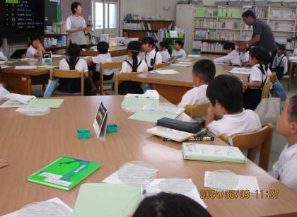 読書の時間(2年生) 公開日 2024/06/03 更新日 2024/06/03 学校全体 図書館に来ています。課題図書である「アザラシのアニュー」という本の読み聞かせを聞き、感想を伝えたっているところです。