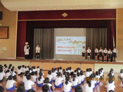 保健委員会さんから 公開日 2024/06/04 更新日 2024/06/04 学校全体 全校朝会で、保健委員会さんからの発表がありました。テーマは「心を元気にして友だちと楽しくすごすため」で、教頭先生も参加して劇の形での発表でした。ものの感じ方は人それぞれ違うことや、見ただけで判断せずにその人のことを「知ること」が大切だということなどを伝えてくれました。
