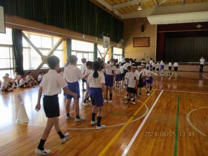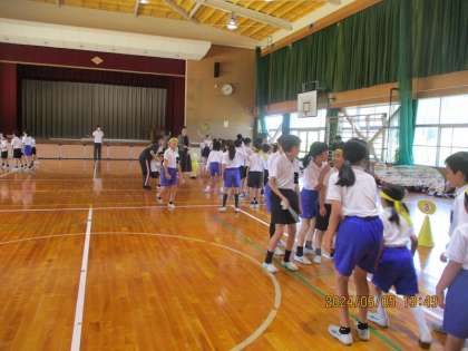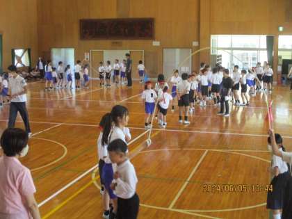 長縄跳びの練習が始まり、3分間ずつ練習をしました。初めての1年生も加わり、また、上級生も久しぶりでしたので、去年のように続けてとはなりませんが、1年生の背中をそっと押している姿や跳べたと喜んでいる姿などが印象に残りました。
