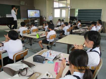 リコーダーを使っての活動が始まりました。初めての今日は、吹く部分だけでいろいろな音を出しています。