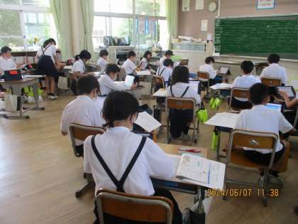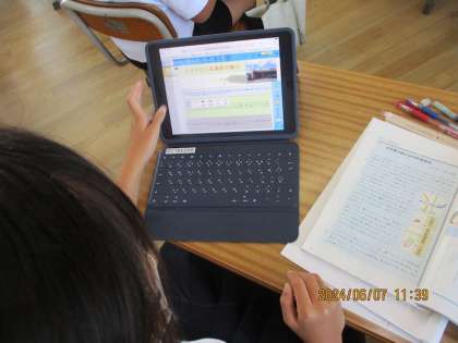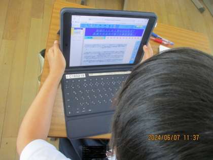 5年2組さんは、タブレットで、高瀬駅や地域の店など高瀬町の魅力について一人ひとりまとめています。
