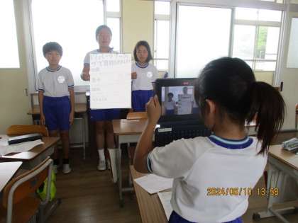 同じ時間に1組も2組も、SDGsの選んだ項目についてまとめた内容の発表練習をしていました。動画を撮って振り返ったり、先生に見てもらったりしながら、発表に向け協力し合って練習に取り組んでいました。