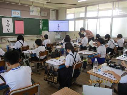 習字の時間、ひらがなで「きずな」を書く練習です。3文字のひらがなは難しそうですが、集中して取り組んでいます。