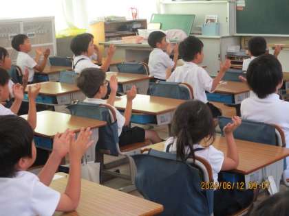 音楽の時間です。習った歌を楽しく歌っています。「しろくまのジェンカ」では、「タン ウン タン ウン タン タン タン ウン」のリズムに合わせて手をたたきながら元気に歌いました。