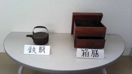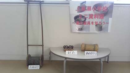 3年生は、社会科の学習で昔の道具やそれを使っていた頃の暮らしの様子について調べ、人々の生活の様子が道具とともに移り変わっていることを学びました。そのときに使った道具を中央廊下に展示しています。何をするための道具かわかりますか?