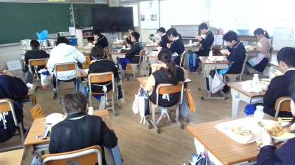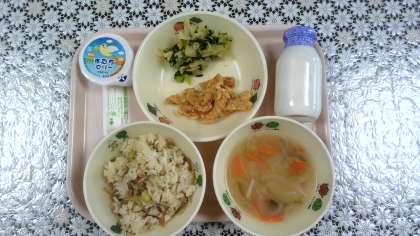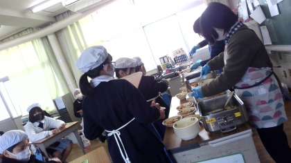 今日の給食の献立は、「肉もっそ、牛乳、いかのさらさ揚げ、キャベツのおひたし、ふしめん汁、すだちゼリー」です。ふしめんは、麺を棒にかけて干した時に上側にかかっている麺のはしのことです。修学旅行で行った小豆島で作られています。すだちゼリーには、4月から新しい環境へと元気に巣立っていけるようにという願いが込められています。