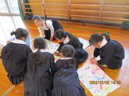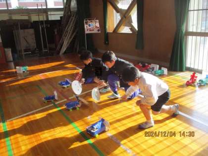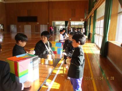 1年生を招待するおもちゃフェスタがいよいよ明日になりました。今日は体育館で、実際の場所に置いてみました。説明の練習をしたり、その場所で遊んでみたりしながら、とても楽しみにしているようです。
