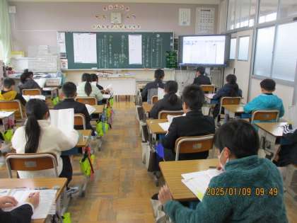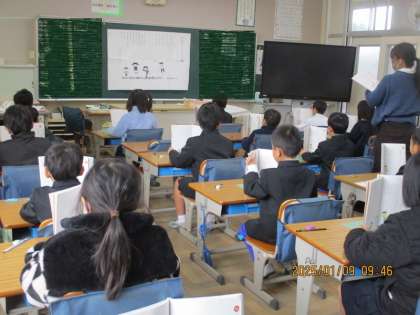 1年生は、詩「みみずのたいそう」です。みんなで音読しています。3年2組は、俳句です。春夏秋冬それぞれの季節の俳句を季語を考えながら学んでいます。5年2組は、「枕草子」です。5年生になると代表的な古典を学ぶんですね。