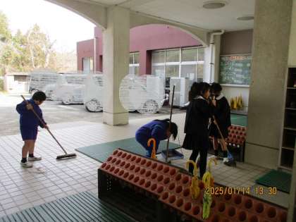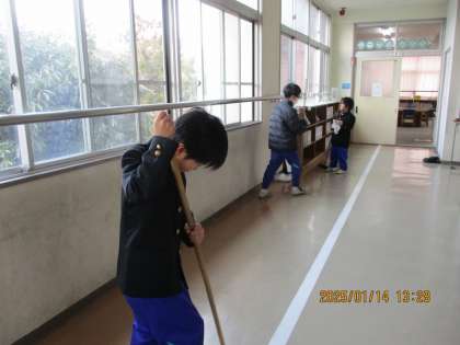 3学期の新しい場所での清掃が今日から始まりました。まず始めは、それぞれの場所ごとに上級生がリードして、分担や掃除の仕方を話し合いました。そのため短い時間となりましたが、新しい役割での掃除をがんばる姿があちらこちらで見られました。