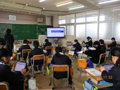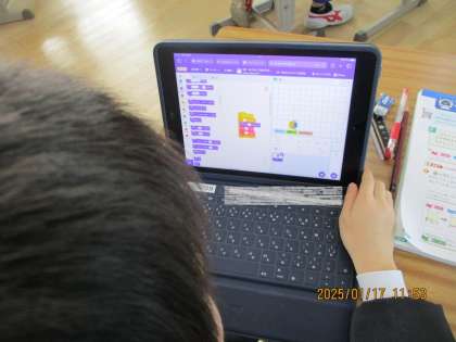 プログラミング(5年2組) 公開日 2025/01/17 更新日 2025/01/17 学校全体 ICTの先生と一緒に、プログラミングに挑戦です。指示を組み合わせて、図形を描くプログラムを作成しています。