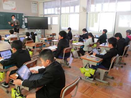 外来種って(3年1組) 公開日 2025/01/21 更新日 2025/01/21 学校全体 国語は説明文「カミツキガメは悪者か」の学習に入っています。生き物についての考えを深めようという内容のようです。今日は、外来種について知っていることを話し合っています。タブレットでも調べました。