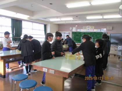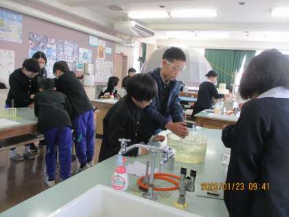 炭酸水に溶けているものは?(6年1組) 公開日 2025/01/23 更新日 2025/01/23 学校全体 理科の実験です。炭酸水には何が溶けているのかを調べます。試験管にその気体を集めているところです。うまく溶けている気体が何かを見つけ出すことができたでしょうか。