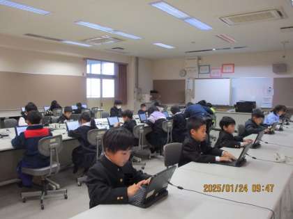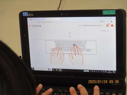 らっこたんで1年生も 公開日 2025/01/24 更新日 2025/01/24 学校全体 ICTの先生と一緒に、「らっこたん」を使ってタイピング練習に挑戦しました。両手の指を使うのは難しいですが、集中してがんばっていました。