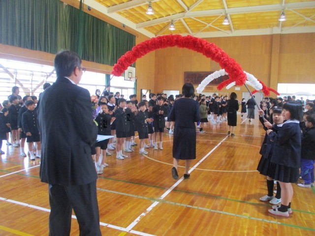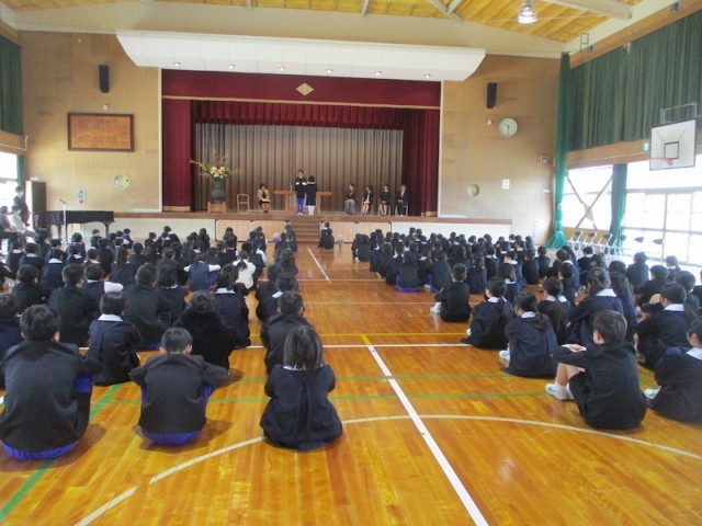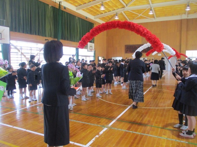 上高瀬小学校を転退職される先生とのお別れの式を行いました。代表児童が手紙を読み、鉢花を渡した後、おひとりずつ、全校生にお話をしてくださいました。最後は、「ありがとうの花」の歌と手拍子に送られながら、アーチをくくり、体育館を後にされました。