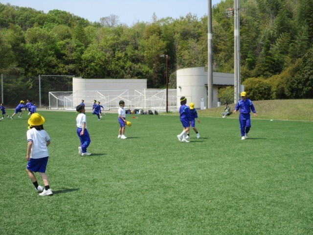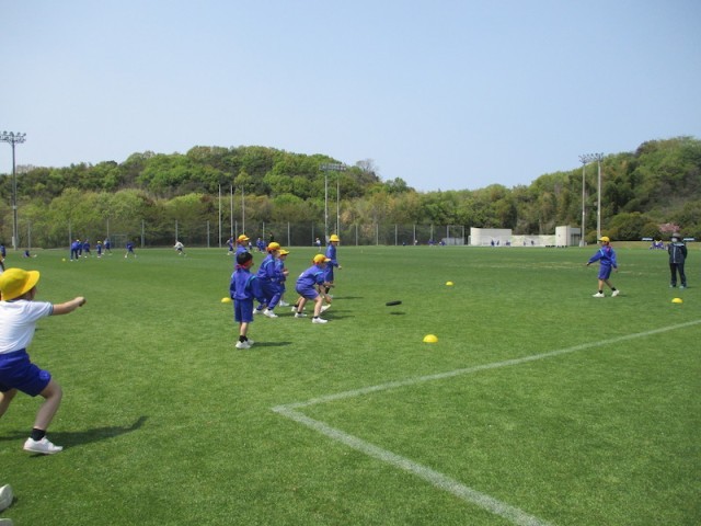 お弁当とおやつを食べた後は、色別班で遊びました。ドッジボールやドッチビー、おにごっこにケイドロ、だるまさんの一日など、6年生がリーダーとして遊びを進めることができたので、広いサッカー場に歓声が響いていました。