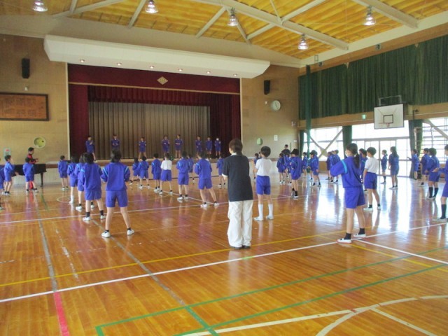 4時間目は体育館でダンスの練習です。今年も希望者がダンスリーダーになっており、ステージ上で振り付けを伝えています。